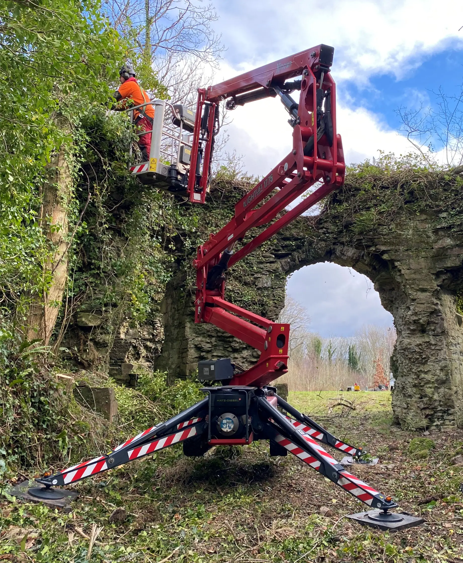 The highly compact spider boom could then be tracked into position through narrow openings in the castle walls and set up to allow tree surgeons to reduce the trees branch-by-branch.