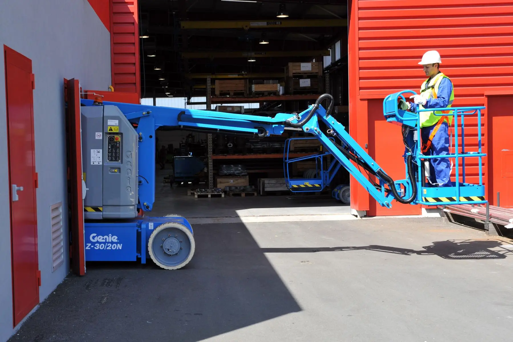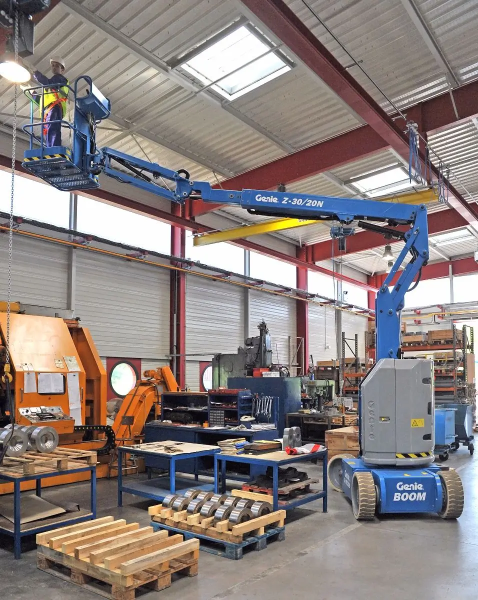 - Electric articulating boom with jib, designed for narrow aisle work