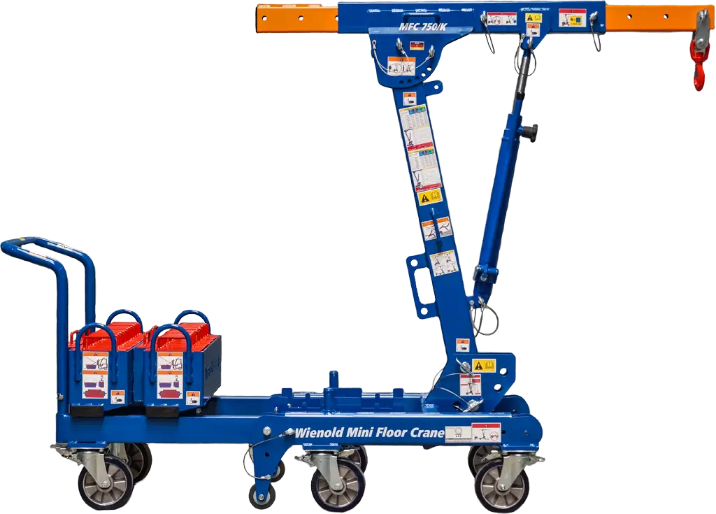 The Wienold Mini Floor Crane (MFC) K model is designed to suit a range of indoor and outdoor applications. It features two reverse-mounted outriggers with counterweight boxes for extra stability, and can lift loads of up to 900kg to a height of 2.90m.
